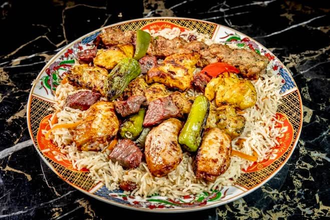 A selection of Afghan chicken tikka, murgh wings, chopan Kebab, Kobeda kebab, murgh seekh kebab served straight from the grill served with Kabuli Rice