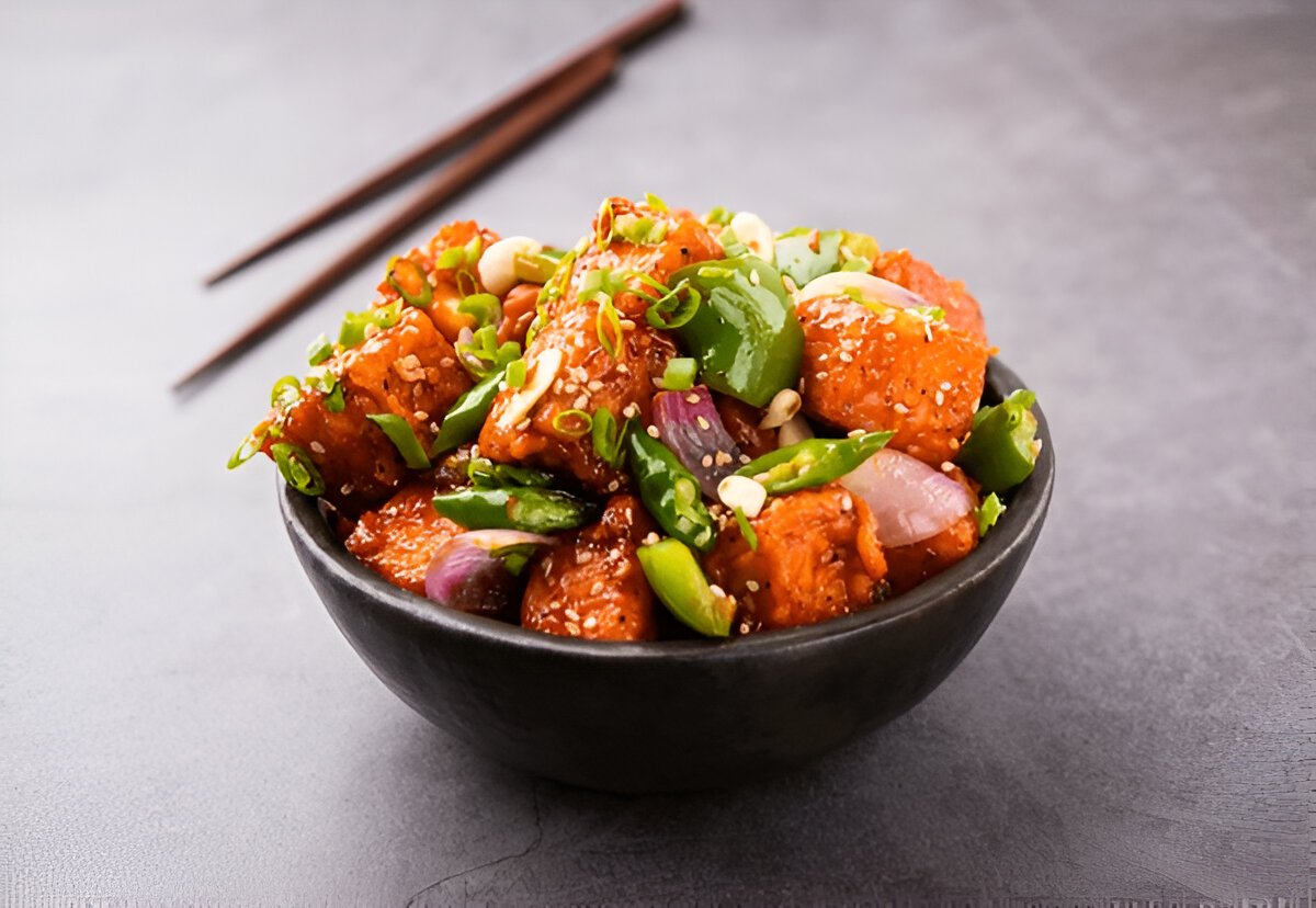 A fusion of flavours crispy paneer cubes tossed in a tangy tossed in a tangy and spicy chili garlic sauce with bell peppers and onions