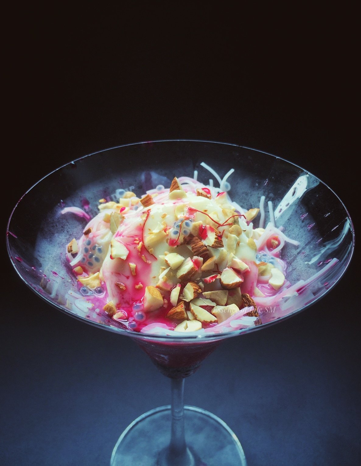 A rich and creamy Afghan style Kulfi Falooda, infused with saffron and cardamom topped with pistachio and rose syrup